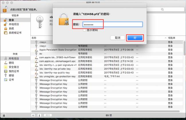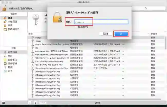 这样后面打包时iOS证书才不会报错,输入创建iOS证书设置的密码,导入进去。