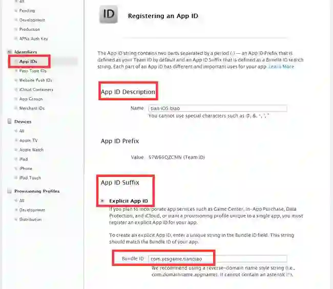 第二项Bundle ID (App ID Suffix),这是你App ID的后缀,需要仔细填写。用来标示我们的 app,使它有一个固定的身份,和你的程序直接相关。填写 Explicit App ID 的格式为:com.company.appName,照着格式写,写个方便记的,后面很多地方要用到。