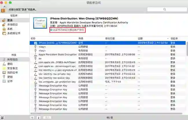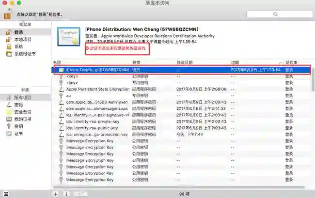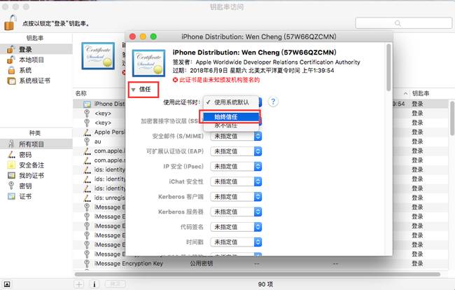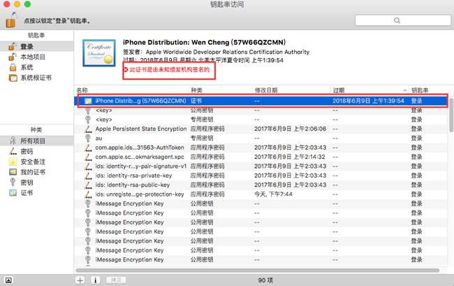 1.2导入后提示此证书是由未知颁发机构签名的,因为不是用本机的钥匙串文件申请的iOS证书