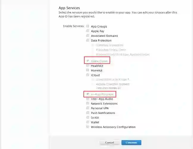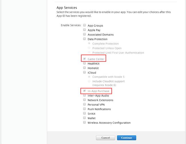 第三项App Services,默认会选择2项,不能修改,其它如APP需要推送通知就勾选下推送通知的服务,没有其他要求选择默认的,然后点击Continue确认,下一步。