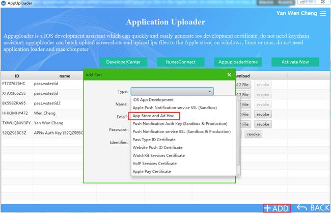 2.3点击+ADD,这里有开发证书等等创建选项,这里选第三项发布证书。