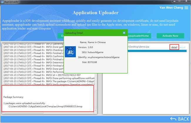 6.2选择刚生成的iap包、Appuploader将自动上传你的IPA,当出现以下提示时,说明上传成功,点击deail可以查看APP信息。