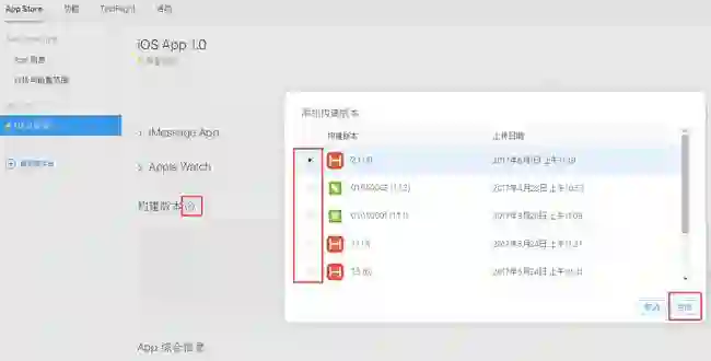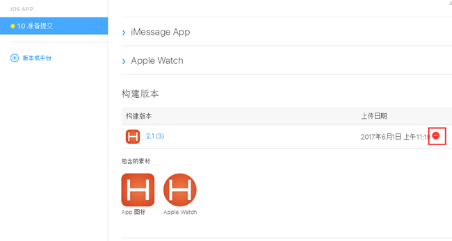 点击删除又会出现+号,可选择其他上传的版本去提交审核。