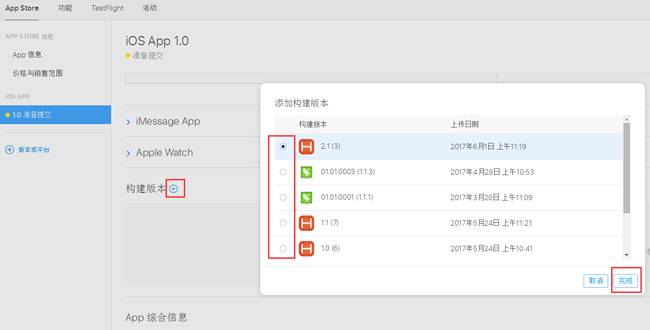 7.1上传好了IPA,然后回到iTunes Connect,进入填写信息的页面,下边有一个构建版本的选项,之前这旁边没有+号的,如果上传成功了,过几分钟旁边会出现一个加号按钮,点击一下+然后会出现你刚上传的APP,有上传多个版本会出现多个,点选、点击完成即可。
