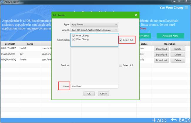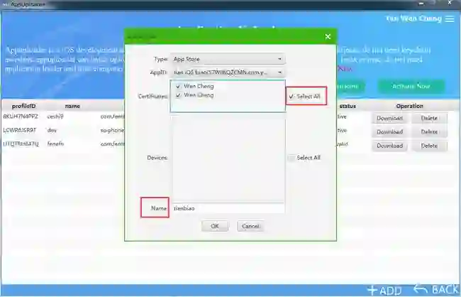 3.4勾选刚创建的发布证书关联好,输入name,点击ok