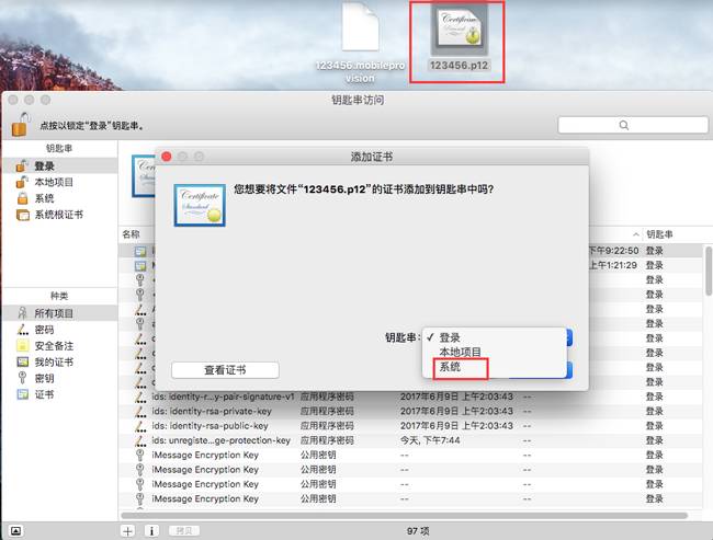 1.1打开钥匙串助手,双击p12文件,默认钥匙串是(登录),注意这里一定要选择(系统)