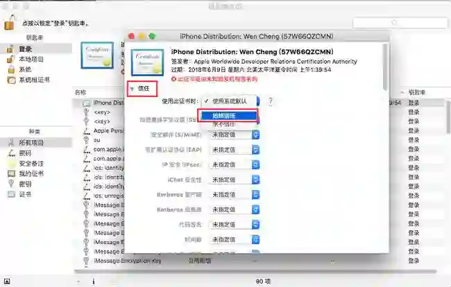 1.3双击证书、点击信任,使用此证书时,设置为始终信任。
