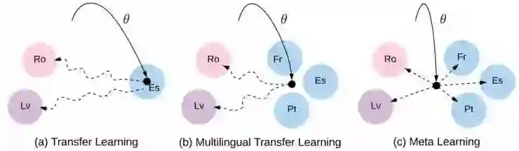 迁移学习、多语言迁移学习与元学习之间的区别。 实线:初始化学习。 虚线:调整路径 (Gu et al., 2018).