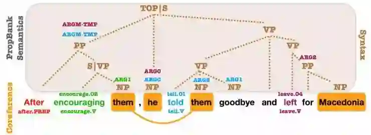 OntoNotes的句法、PropBank和共指注释。PropBank SRL参数和共指提及被标注在了句法成分的顶部。几乎每一个参数都与一个句法成分有关。 (Swayamdipta et al., 2018)