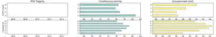 BiLSTM 和 Transformer预训练表示在词性标注、选区分析和无监督共指解析((从左到右)上每层的性能。 (Peters et al., 2018)