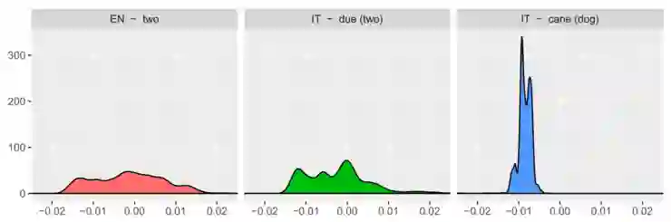 三个词的相似度分布。 等效翻译(「two」和「due」)的分布比非相关词(「two」和「cane」——意思是「dog」)的分布更为相似。(Artexte et al., 2018)