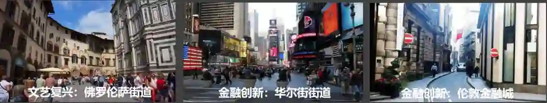 在公元1000年的时候,佛罗伦萨的弯曲小街道就孕育了欧洲的文艺复兴,当时这些小街道集聚了欧洲最牛的思想家、文学家、哲学家、物理学家、天文学家等,文艺复兴就是在这种环境下,通过不同学科进行碰撞交流产生的火花。回过头来看今天,全球最顶级的创新空间在华尔街、在伦敦金融城这些地区。华尔街500米的小街道能实现什么?作为金融从业者,在这里喝咖啡是能够感受到竞争对手在街对面喝咖啡产生的信息存在,这种交流不需要语言,只需要打个照面,一个眼神就知道对手最近在考虑什么,要怎么去应对,该怎么去跟进,这种信息的交换需要街区这种空间,通过亲近的、面对面的方式来实现的。