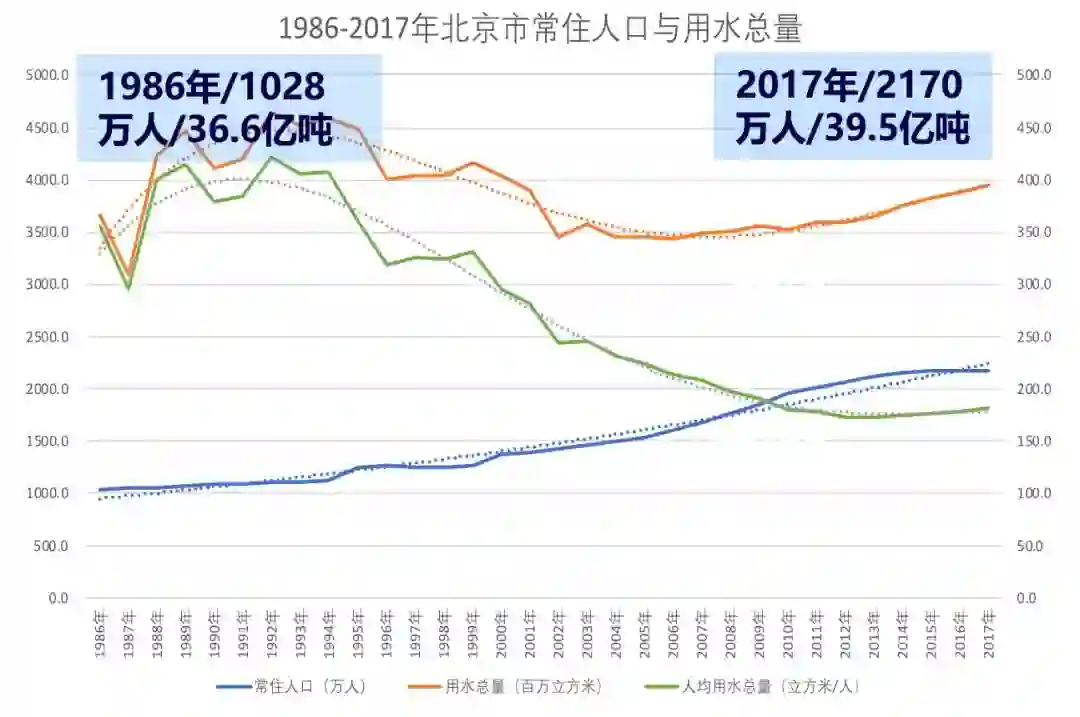现在很多城市都提出控制人口,其中一个重要论据就是以水定人、以水定产、以水定地。我们看看北京1986年,当时1028万人口,当时消耗了36.6亿吨水,到2017年,按照统计局统计口径,北京有2170万常住人口,实际消耗水资源的人口远不止这个数,大概有3000万,这时消耗了39.5亿吨水,可以看到人口增长了一倍多,但是对基础设施的消耗没有很大变化。