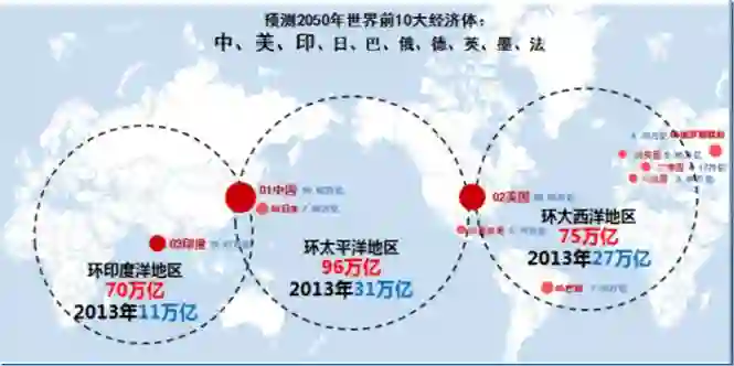 另外一个维度,从工业革命发展的历史,简单总结下来有三个阶段;第一个阶段是第一次工业革命和第二次工业革命前期环大西洋的贸易圈;第二阶段就是当下正在面临的环太平洋贸易圈;未来全球人类共同走向更加成功、更加现代化的生活,将来的人口城镇主要集中在环印度洋的圈里,在这样的发展形势下国家提出一带一路的倡议。围绕一带一路将来新的合作关系,我们要构建出新的连接来,就是通过航海、航空网络与全球形成更加紧密的经济合作关系。