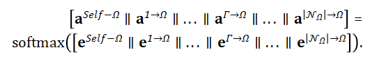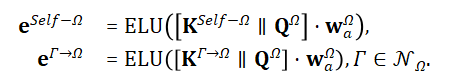 利用注意力机制将这些临时的特征聚合起来,从而全面地刻画目标对象的特性。首先,通过不同的参数将目标对象的自身投影特征映射为注意力的查询值和键值,也通过不同的参数将邻居的聚合特征映射为相应的键值: