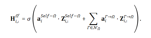 利用归一化的注意力系数,将若干个临时特征聚合起来,形成目标对象本层输出的新的特征: