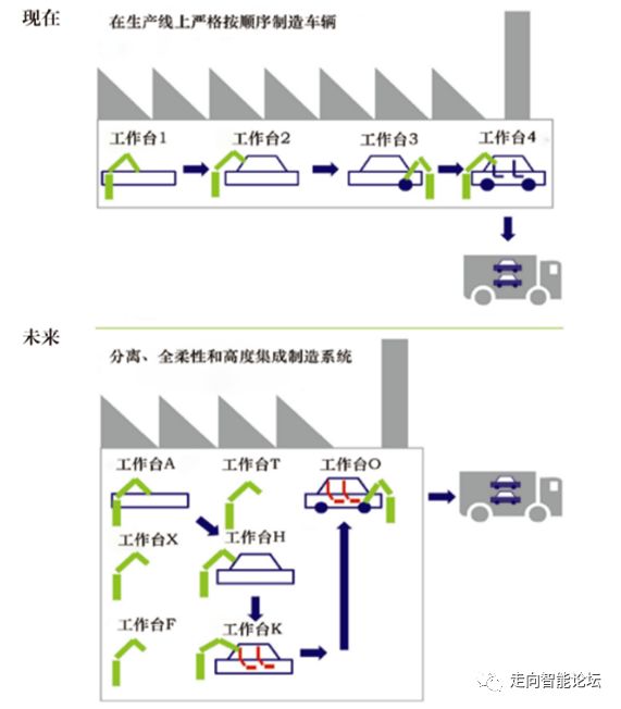 定制化生产也是德国工业4.0战略中非常关注的内容。德国工业4.0强调指出:“支持定制生产:如何满足客户个性化的需求,工业4.0的动态价值链能使客户和特定产品的设计、配置、订货、计划、生产和物流得到统一协调。这也为即时响应、生产前甚至在生产过程中最后一分钟的需求变更提供了支撑的可能。”并举例说:“实施工业4.0的结果是出现动态生产线。车辆成为可以通过装配车间从一个赛博物理系统功能处理模块到另一个自主移动的智能产品。动态重新配置生产线,使得它可以与合适车辆的设备混装并匹配。此外,个体差异(如从另一个车系列配备座椅)可以在任何时间根据物流情况加以执行(如瓶颈问题),而不被中控系统事先设定的时序所约束。执行这类重新配置将很简单,汽车可以自主移动到相关的工作站。现在的制造执行系统IT解决方案构成一个核心组成部分,从开始到结束——从设计到组装和操作。”请见图2。