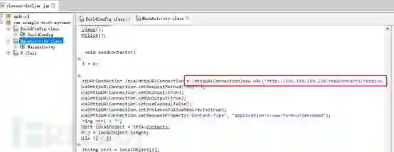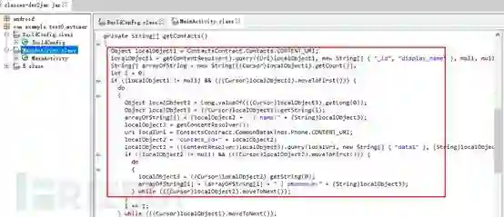 继续阅读源码,我们发现代码里有读取联系人的操作,同时将读取结果拼接到URL参数中向远程服务器发送。