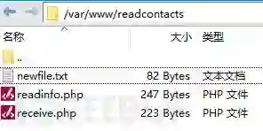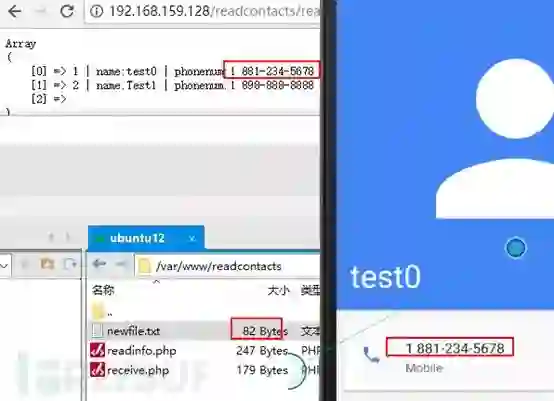 在使用此应用时,我们并未发现什么异常情况,现在我们把视角切换到ubuntu服务器上,这个时候就会发现newfile.txt中多出了一些内容,然后我们访问readinfo.php,就可以看到手机上的联系人信息