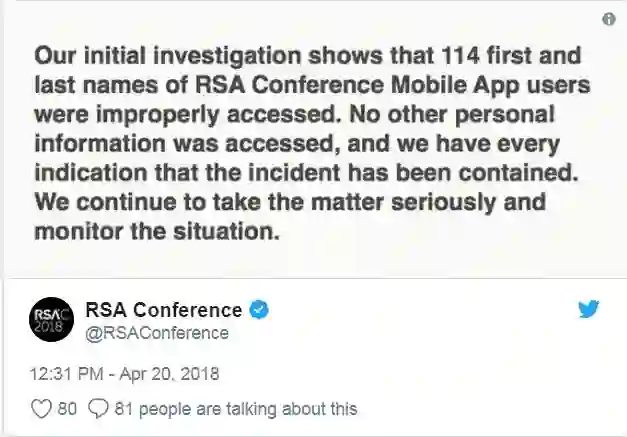 我们的初步调查表明,RSA大会移动应用程序的114个用户的姓名遭到不适当访问。其他个人信息没有被访问,我们明确表示,该事件已得到了控制。我们会继续重视此事,密切关注势态。