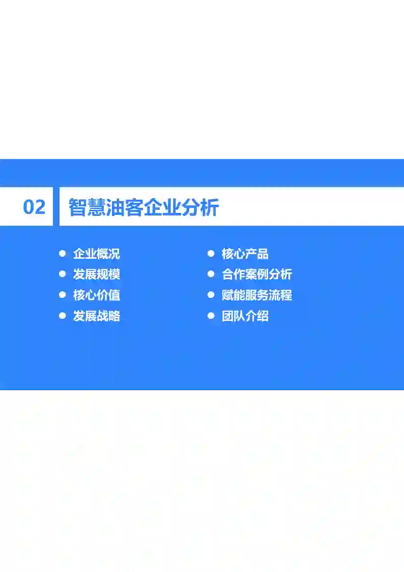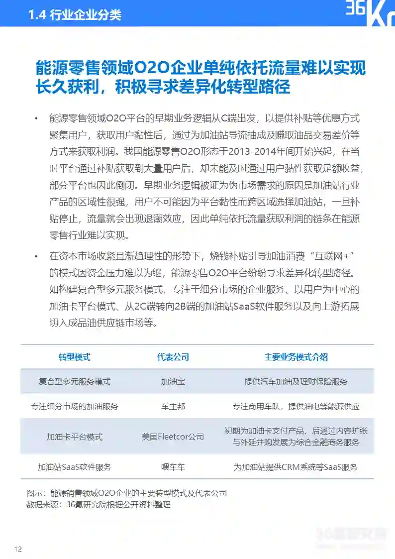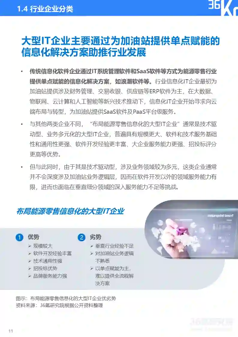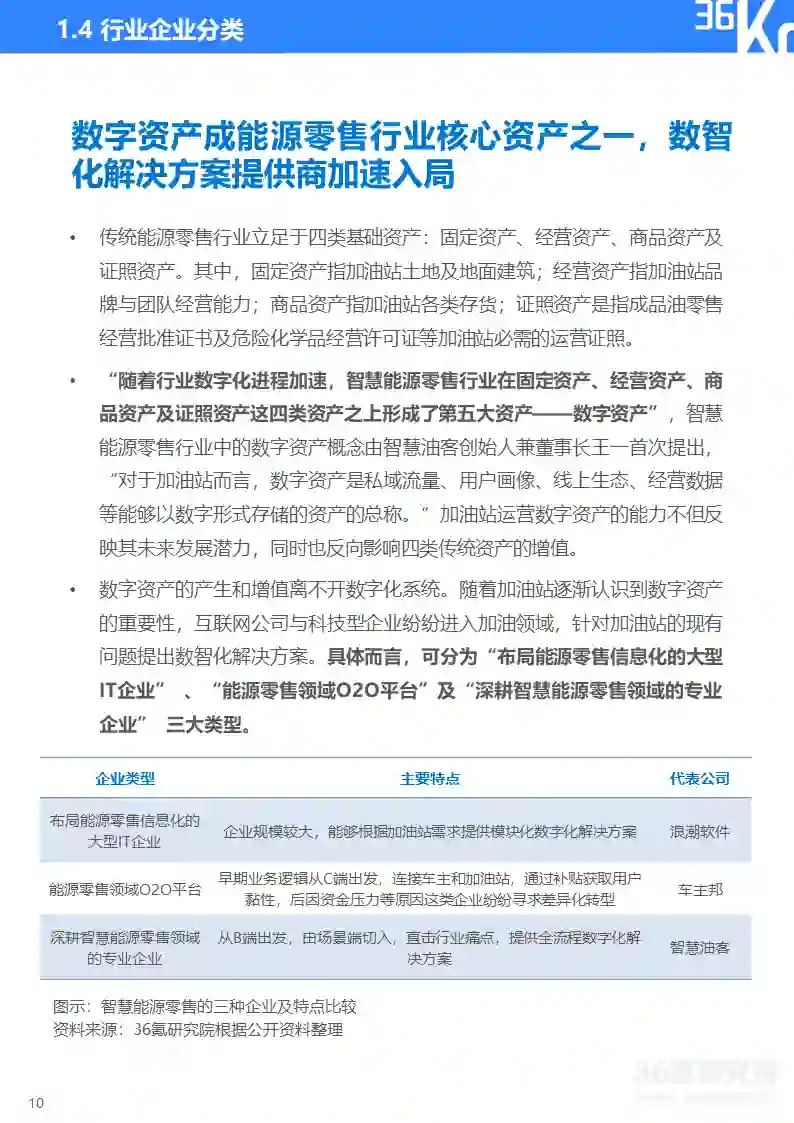 本报告研究重点为深耕智慧能源零售领域、具备全流程数字化解决方案能力的专业企业。这类企业由场景端切入市场,是最懂得B端加油及加气站痛点的企业,其业务出发点在于运用人工智能、大数据、云计算等新一代信息技术,为能源零售行业提供“服务+软件+硬件赋能”的全流程数字化解决方案,消除不同场景下加油及加气站的痛点,赋能行业全面发展。因而相较于其他两类企业,细分垂直领域专业企业往往更加专注于能源零售行业深层次业务逻辑的研究,提供的产品更有靶向性。