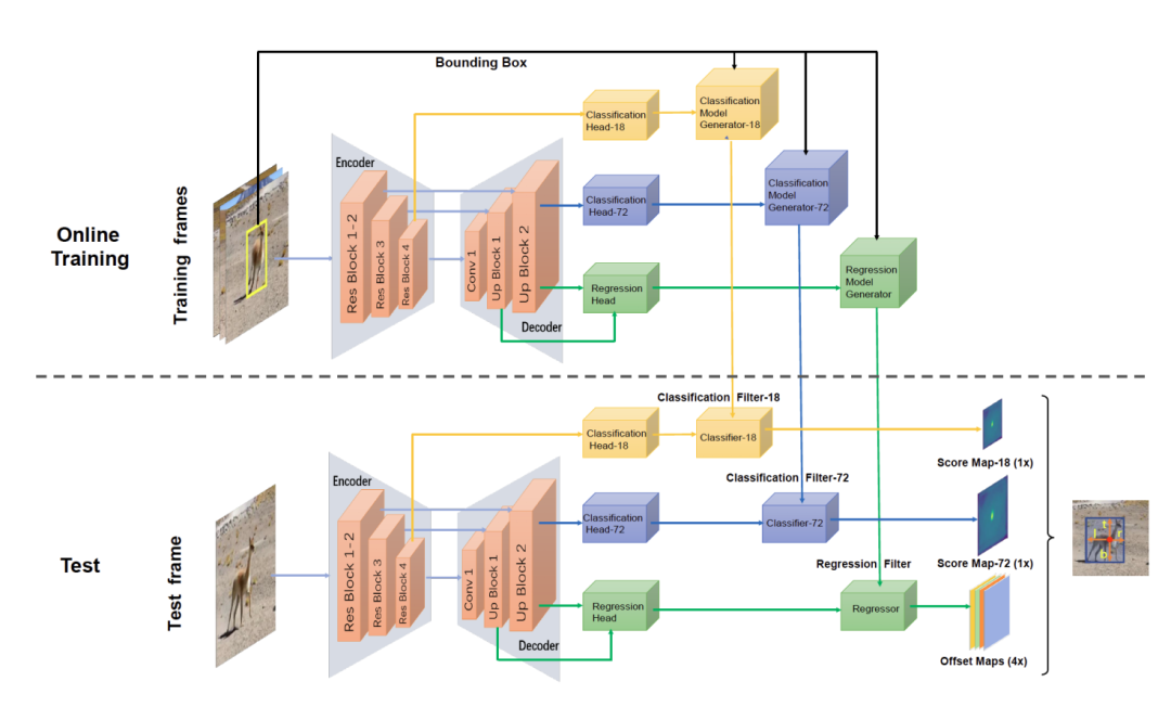 1. 解决跟踪过程中由于目标形态变化等引发的目标框回归不准确的问题,对回归分支首次进行了在线训练;