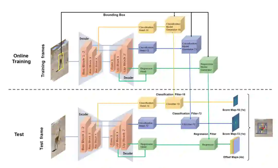 近年来,基于Siamese的方法可以说是占据了视觉跟踪领域的半壁江山,涌现了像Siamfc, SiamRPN, SiamRPN++, SiamFC++等优秀的方法,既能保证比较好的跟踪效果,又达到了很高的FPS。然而另一类判别式的跟踪模型也同样值得瞩目,像ATOM/DiMP取得了当时的SOTA效果,并且也能达到实时。如果将目标跟踪任务分为分类(粗定位目标)和回归(精确回归目标的框)两个子任务,那么DiMP这类判别式的方法充分证明了对分类任务进行跟踪过程中的在线训练,可以有效地提升tracker的鲁棒性,对于区分前景和背景颇有帮助,也因此在多个数据集上达到了当时最好的跟踪效果。基于此,我们就思考:既然对于分类分支的在线训练已经证明了其有效性,那是否对回归分支进行在线训练能使得跟踪过程中框的准确性更高呢?