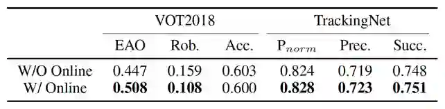 从VOT2018和trackingnet可以明显的看出回归分支在线训练的作用,而VOT的accuracy这个指标之所以比不用在线训练低,是和vot的测试方式有关的。在vot数据集的测试过程中,如果跟丢了目标就会计作lost一次,重新给定目标的真实框进行跟踪。而FCOT加上在线训练之后框更加准确一些,所以也促进了分类分支的在线训练效果,因此lost次数更少,每次跟踪的序列更长一些,accuracy在长序列中就会降低一点。