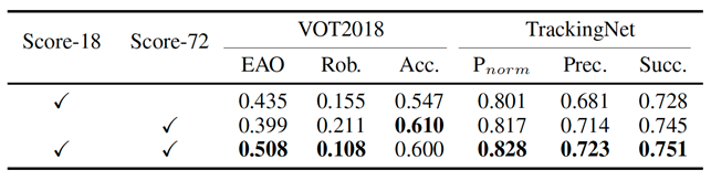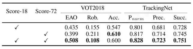 为了保证分类分支定位目标中心点的精度,我们生成了大小为72的分类score map,然后发现score map-72对于相似目标的判定效果不是好,而大小为18的低分辨率score map,虽然精度没有score map-72高,但是鲁棒性更好一些。因此我们将两个不同scale的score map融合进行预测,下面的消融实验也会详细验证。