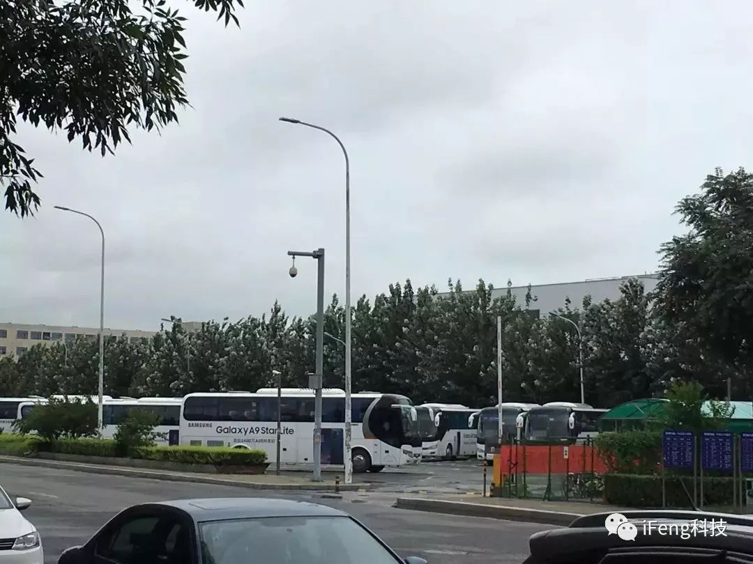面朝工厂正门的左手边是工厂正门的班车停车场,停靠了大约10来辆班车,门口还有几辆网约车和出租车在趴活儿。距离正门3、4百米的一个侧门,停了几辆等待拉货的大型货车。从表面上看,这完全不像是一家韩媒所报道的将要停止运营的工厂该有的样子。