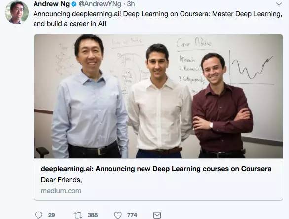 美国太平洋时间 8 点 16 分,吴恩达在推特上发布了重磅消息:deeplearning.ai 课程登录 Cousera,并同时在 Medium 发布博文介绍这套课程。
