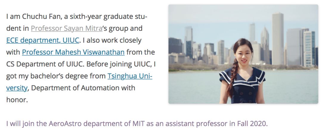 近日,清华大学2013届本科毕业生、美国伊利诺伊大学香槟分校(UIUC)在读博士生范楚楚在个人主页上宣布,她将于2020年秋季加入麻省理工学院航空航天工程系担任助理教授一职。