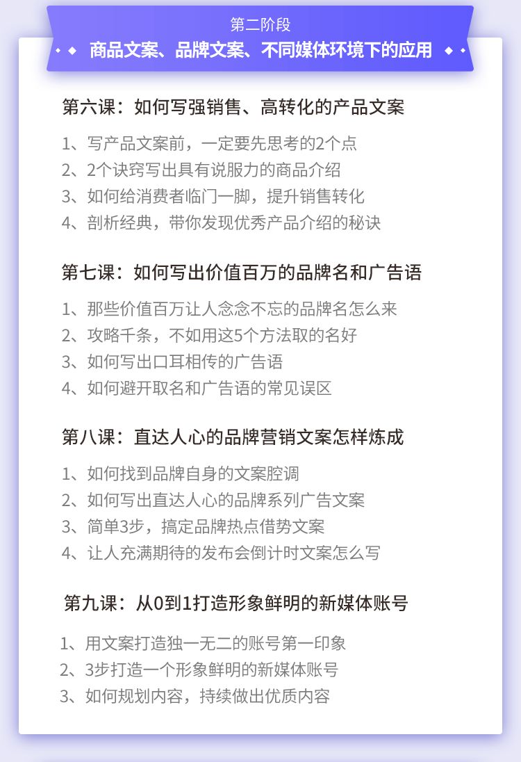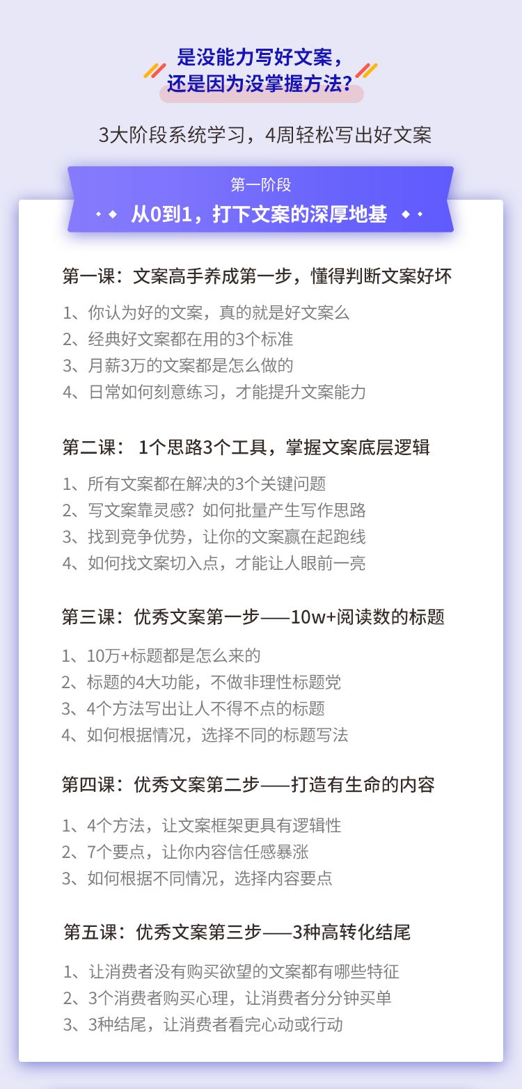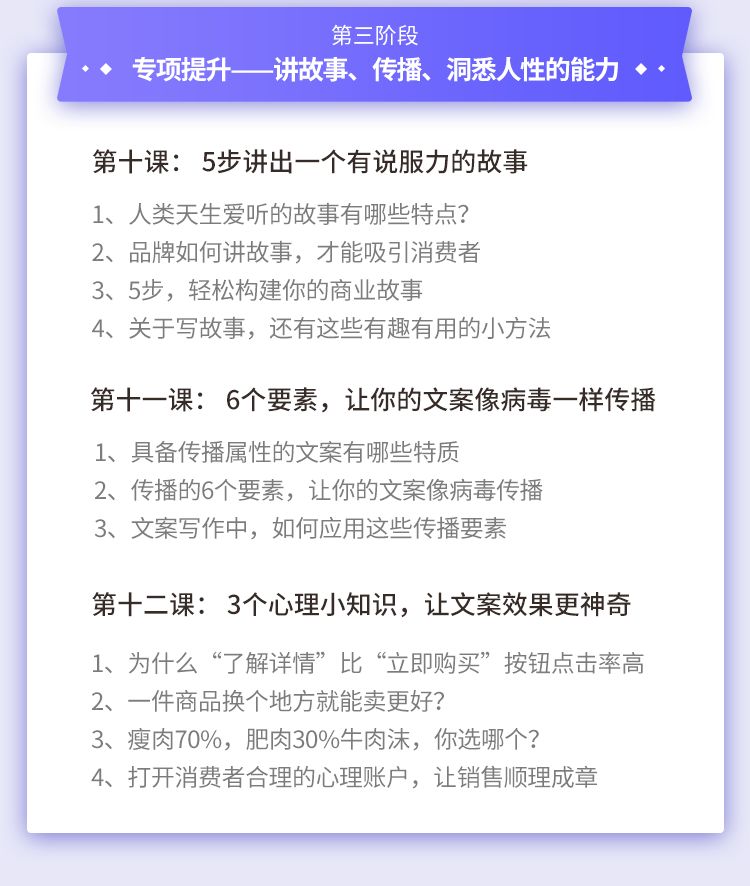 你逐步掌握: 文案的底层逻辑、标题/内容/结尾的写法/、销售文案的写法、品牌文案的写法、文案传播的要素等