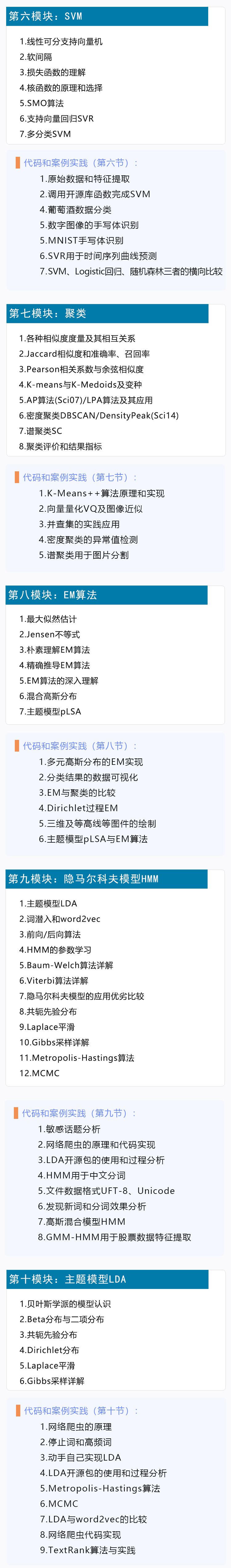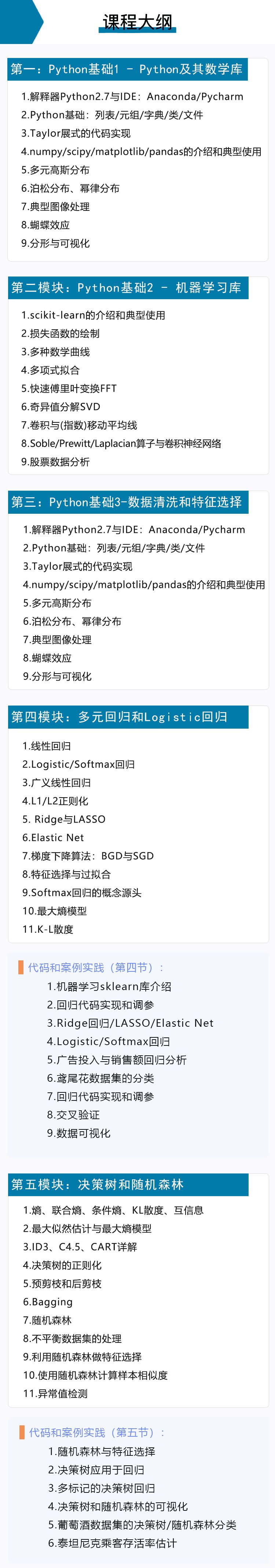 课程强调动手操作;内容以代码落地为主,以理论讲解为根,以公式推导为辅。共16天16个模块32个学时,每学时各1~1.5小时,136个知识点,82个代码和案例实践,讲解机器学习和深度学习的模型理论和代码实践,梳理机器学习、深度学习、计算机视觉的技术框架,从根本上解决如何使用模型、优化模型的问题;每次课中,首先阐述算法理论和少量公式推导,然后使用真实数据做数据挖掘、机器学习、深度学习的数据分析、特征选择、调参和结果比较。