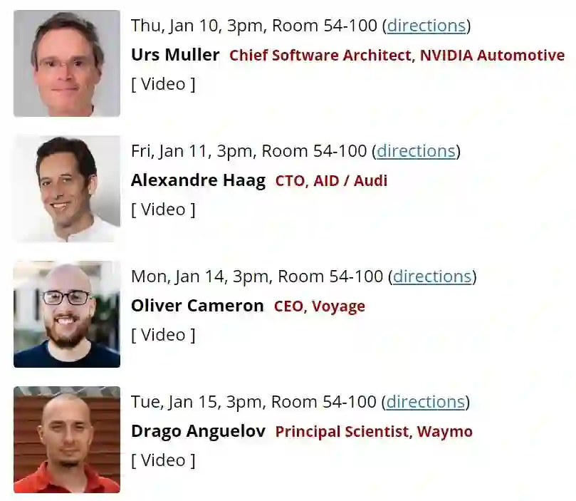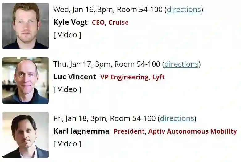 在讲座部分,MIT 邀请了众多来自科技公司的自动驾驶研究院的科学家,包括英伟达、奥迪、Voyage、Waymo 和 Aptiv。