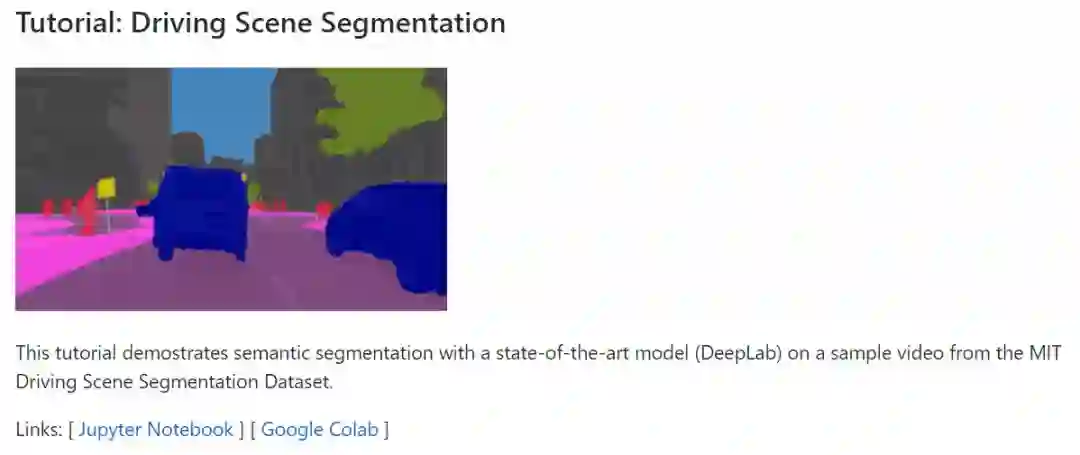 在相关 GitHub 页面中,MIT 提供了几个有趣的实现,可以在 Colab 或 Jupyter Notebook 上运行。如下图所示,使用 DeepLab 对来自 MIT 驾驶场景分割数据集的样本视频进行语义分割。