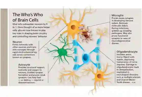 在巴雷斯刚接触到神经胶质细胞的年代,研究人员已经知道少突胶质细胞形成被称为髓鞘的脂类隔离层,从而包裹神经元的轴突。他们推测,小胶质细胞(它就像是我们身体内的免疫细胞)能吞噬分子碎片和通过血脑屏障的病原体。星形胶质细胞则为神经元提供营养物质并负责排出废物。