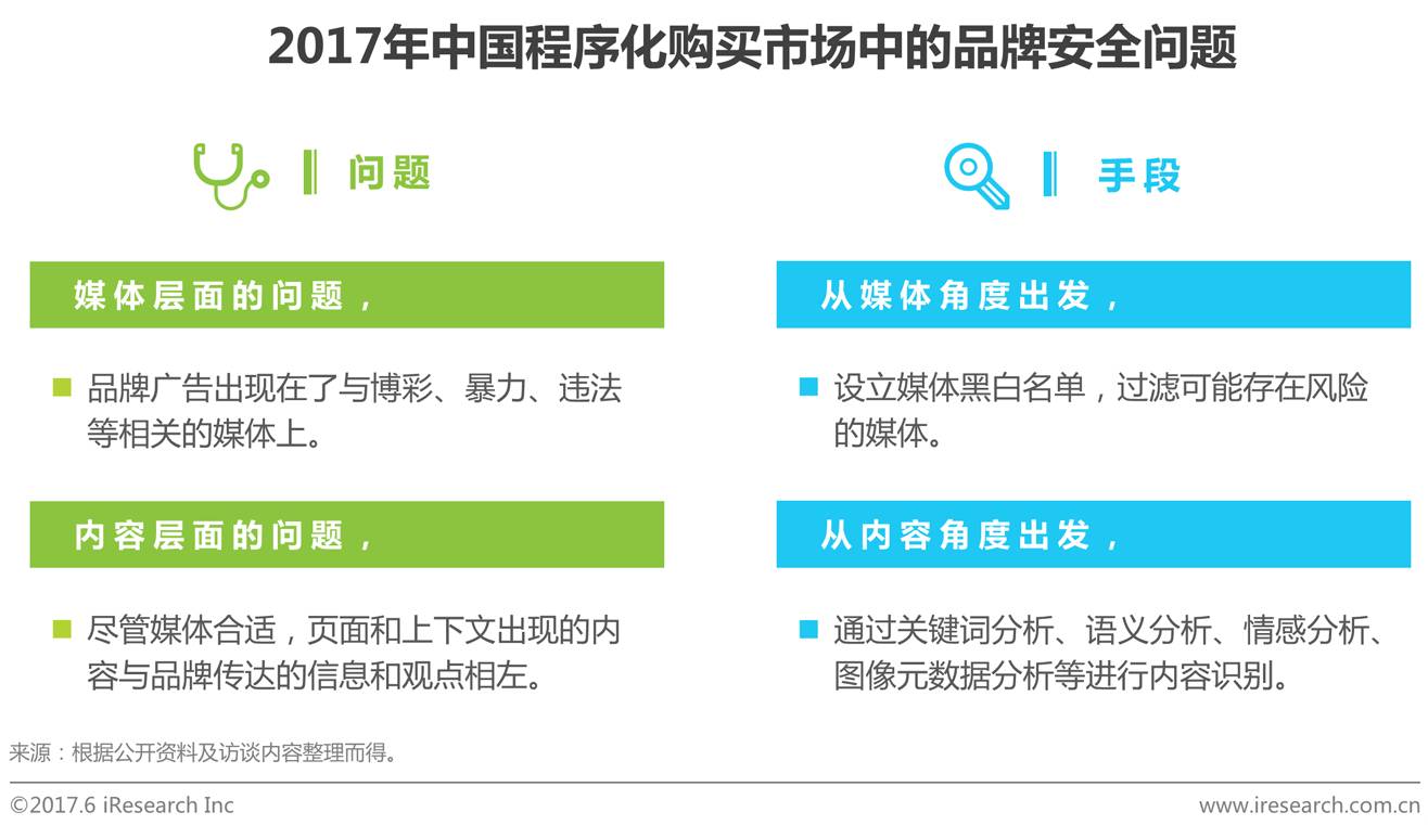 品牌安全是指,品牌所投放的广告出现在了不合适的媒体或内容中,让消费者产生不适、反感等负面情绪,从而影响到消费者对品牌的看法和态度,最终伤害品牌形象。在程序化购买过程中,尤其是RTB模式下,由于受众购买的特性,广告主很难决定投放媒体和内容,品牌安全面临更加突出的问题。为解决广告主面临的品牌安全问题,已经出现专业化的广告验证服务商,同时广告技术公司也都投入更多的精力到品牌安全保护中,而品牌安全的保护也有赖于与媒体的深度合作。