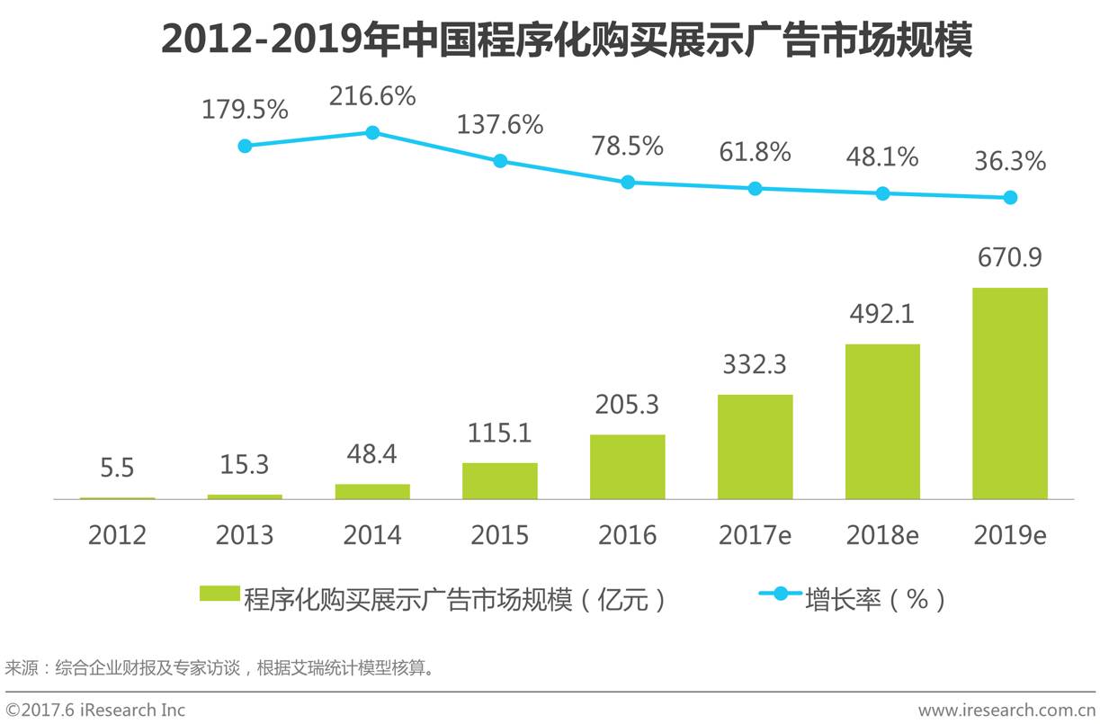 2016年中国程序化购买展示广告市场规模在205.3亿,较2015年增长78.5%,预计到2019年,市场规模将达670.9亿。艾瑞分析认为,自2012年以来,程序化购买连年保持超过100%的增速,到2016年进入调整期,整体增速放缓,从长远看,中国的程序化购买市场仍处在发展前期,未来仍然有较大增长空间,不过在增长模式上,将从过去的高速爆发式增长转向中高速稳健式增长。