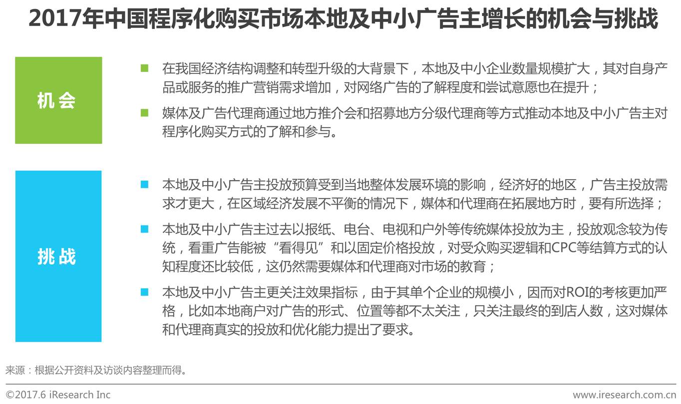 现阶段,程序化购买方式的广告主以快消、汽车、金融、房产等品牌广告主和电商、工具、游戏等互联网类广告主为代表,主要是因为这两类广告主投放网络广告的时间长、经验多,尝试新技术的意愿高、动力大。艾瑞分析认为,随着互联网用户及渠道的整体下沉,本地及中小广告主将成为程序化购买市场需求方中新的增长点,长期来看,这一势头将不会停止,但在短期内,也依然面临着区域经济发展水平不平衡、广告主认知程度较低等多重因素的挑战。