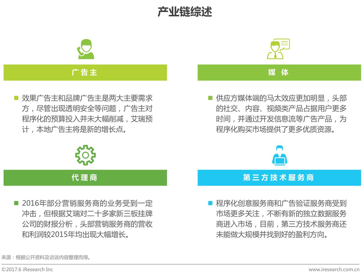 在中国程序化购买市场发展过程中,第三方广告技术公司一直是产业链中的重要参与者,经过多年发展,其市场竞争态势也已经比较明朗:1)市场发展早期,第三方广告技术公司深受资本追捧,随着市场热度整体降温,企业也从过去的跑马圈地、注重流水,发展为现在的精细运营、注重利润;2)在这一过程中,部分第三方广告技术公司相继被媒体巨头或大型传播代理集团收购,而另一部分公司则选择挂牌新三板,为未来寻求更多资本机会打好基础;3)过去一年,在媒体方大力建设程序化广告平台、第三方程序化广告平台自身发展出现调整的情况下,第三方广告技术公司的出路更受关注。