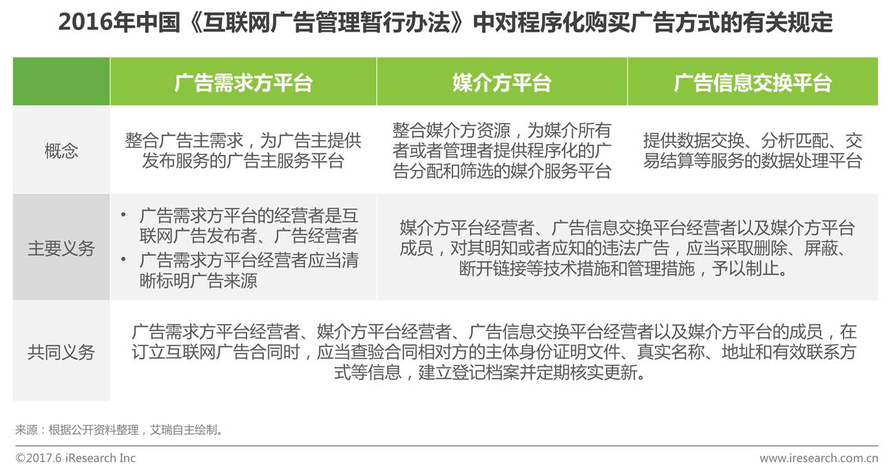 2016年9月1日,由国家工商行政管理总局公布的《互联网广告管理暂行办法》正式实行。在该暂行办法中,程序化购买首次进入监管视野,办法第十三、十四和十五条认可了程序化购买方式,并对程序化购买方式及产业链中广告需求方平台、媒介方平台和广告信息交换平台等主要角色的概念和义务做出了说明。艾瑞分析认为,这些规定实质上对程序化购买参与方设立了准入和参与门槛,通过对参与方主体的监管,解决过去市场中存在的权责不清等问题,程序化购买将由此逐步走向规范发展时代。