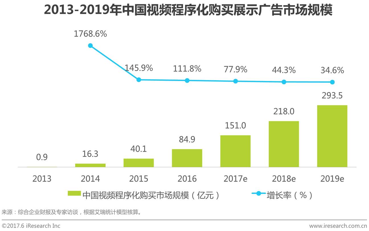 受广告主,尤其是品牌广告主对视频广告的需求快速增长以及媒体端大量视频广告资源的开放,视频程序化购买展示广告市场规模迅速增长,2016年市场规模为84.9亿,较2015年增长111.8%,未来三年仍将保持高速增长,预计到2019年,视频程序化购买市场规模将达293.5亿。
