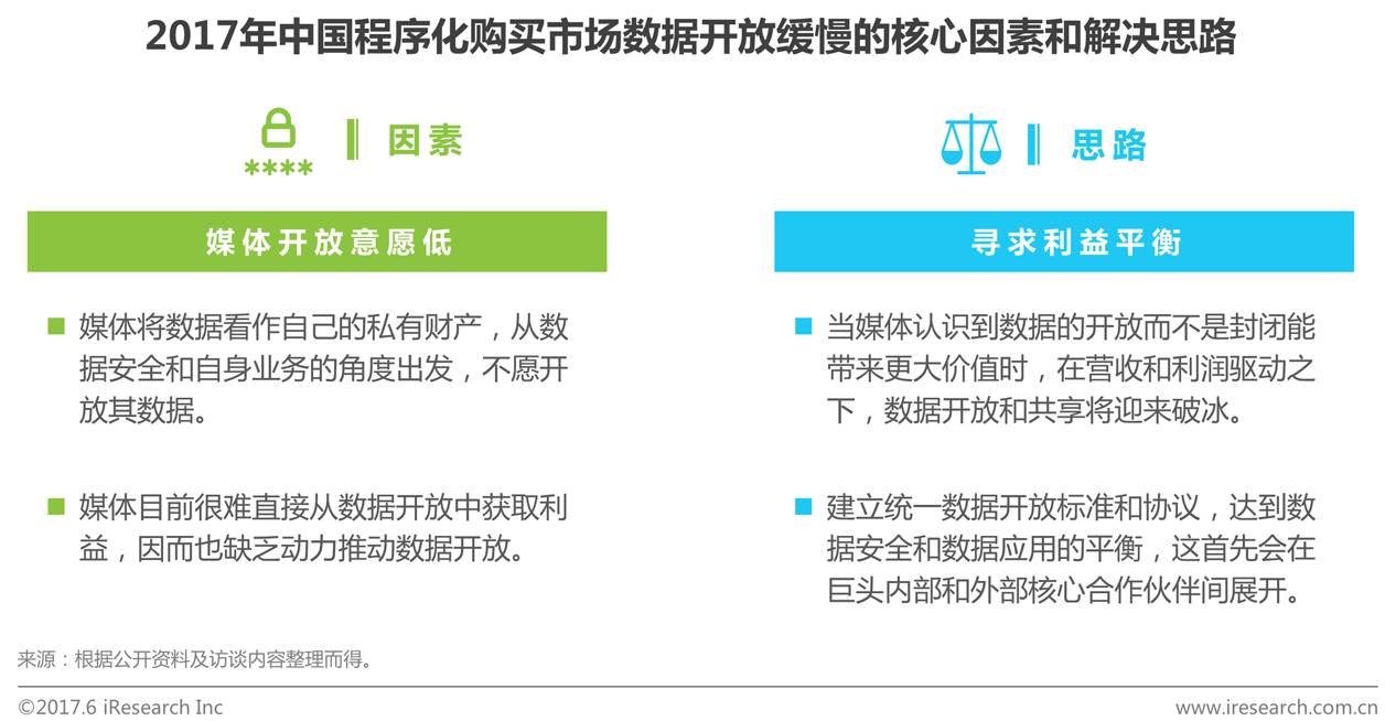 尽管第三方代理公司和广告主都在搭建DMP,但是由于媒体方数据量更大、维度更丰富、颗粒度更细,市场普遍期待媒体方数据的开放。目前,媒体更多是根据广告主及第三方代理公司的数据需求,回传数据结果。艾瑞分析认为,短期内,数据开放仍难有实质性动作,技术不是难点,找到各方角色之间的利益平衡点才是改变现状的关键。