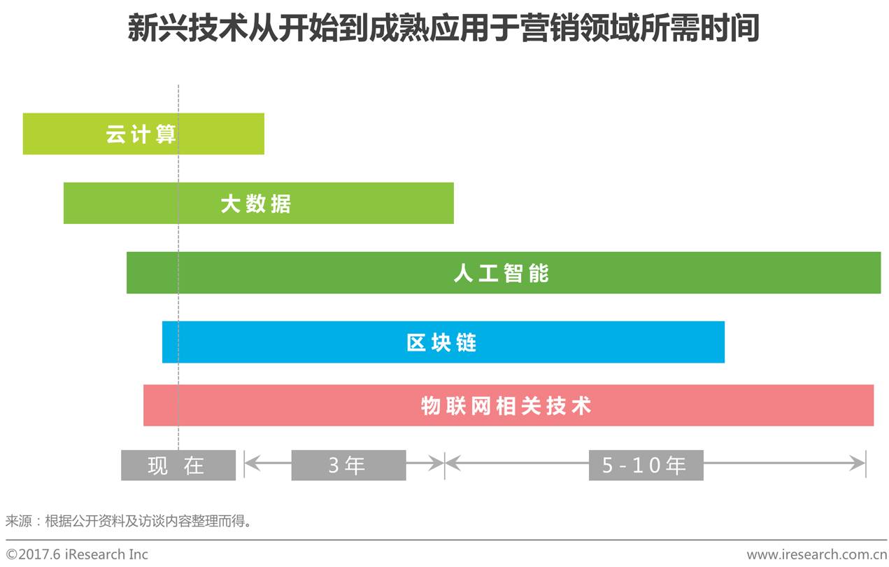 目前,云计算和大数据的应用已经十分普及;人工智能也崭露头角,推动着智能化营销的发展;源起于金融科技的区块链技术则开始解决营销中的透明和安全问题。不远的将来,随着物联网相关技术的成熟,在智能感知的环境中,伴随着场景变迁,营销将更加无处不在。营销从来没有缺席过每一次新兴技术的应用,这一波浪潮也不例外,艾瑞分析认为,人工智能、区块链、物联网相关技术等在营销领域中,从应用到成熟至少需要5-10年的时间。