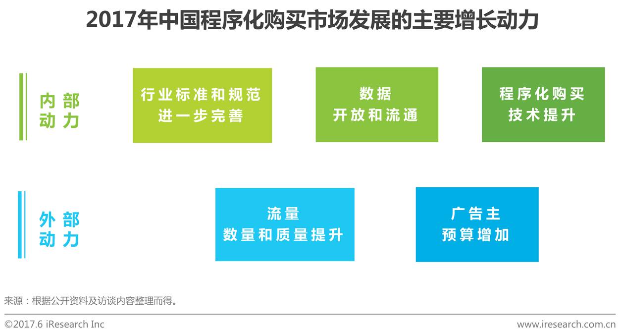 未来程序化市场的增长动力来自内部和外部两个方面:1)内部动力在于,程序化购买市场行业标准和规范的进一步明确完善、数据市场的开放和数据流通加速、程序化购买技术的进步尤其是人工智能、区块链等新技术的应用;2)外部动力则在于,媒体和广告主程序化购买参与度的提升,媒体作为供应方,增加流量数量和提升流量质量,广告主作为需求方,增加程序化购买的预算。艾瑞分析认为,用自动化不断替代各环节中的人工操作是程序化购买发展的终极目标,程序化购买的发展没有尽头,也不会止步。
