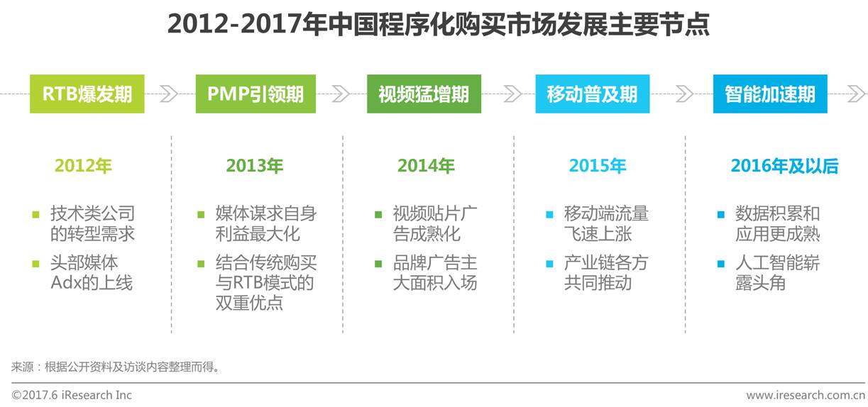自2012年“程序化元年”起,程序化购买在中国落地已有五年。五年间,程序化购买受到资本的热烈追捧,上百家程序化购买平台涌现,先后经历RTB爆发期、PMP引领期、视频猛增期、移动普及期等四个关键发展节点。程序化购买这五年的发展,极大地发挥了技术和数据在广告投放中的重要作用,有效地提升了网络广告投放的效率和效果。