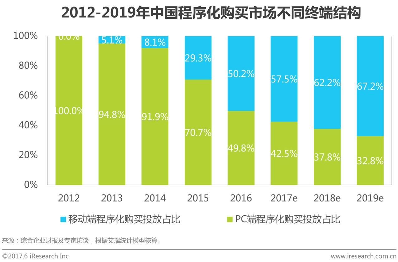 在2016年移动网络广告市场规模首次超过PC端网络广告市场规模的整体环境下,移动端程序化购买流量快速增长,广告主程序化购买预算也大规模向移动端倾斜,2016年移动程序化购买市场规模占比为50.2%,实现超预期增长,历史性超过PC端,艾瑞分析认为,移动端所占比重将不断扩大,预计到2019年,移动端程序化购买规模占比将突破65%。