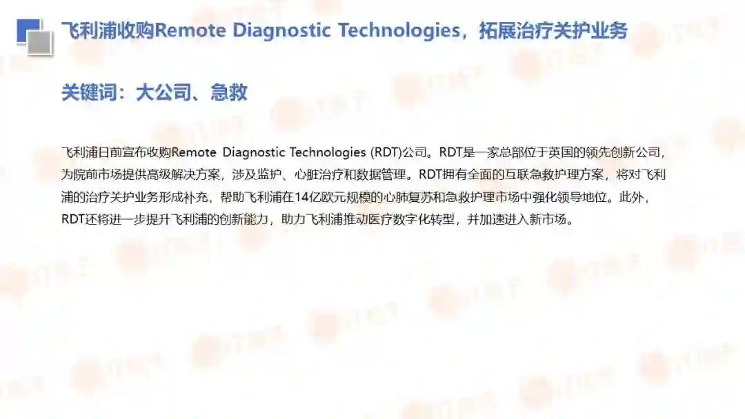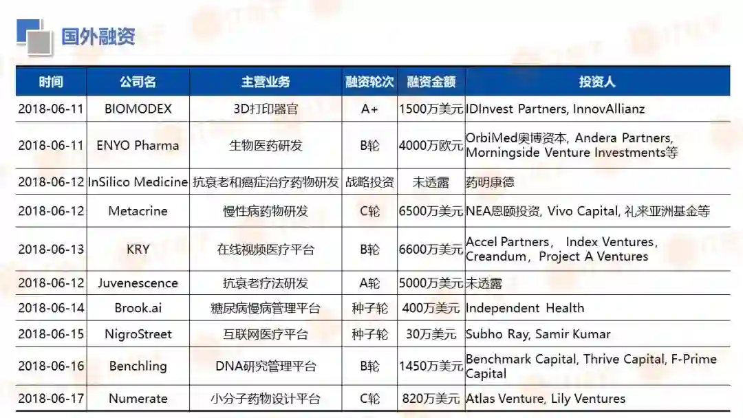 IT 桔子(ID:Itjuzi521)也顺应大健康投资热潮推出了医疗健康周报和项目拆解两个新栏目。IT 桔子医疗健康周报将从投融资动作、政策风向、业内动态等解读行业最新变化。项目拆解将从企业团队建设、产品技术、市场规模、商业模式等方面挖掘企业亮点与价值,为医疗创投提供参考。