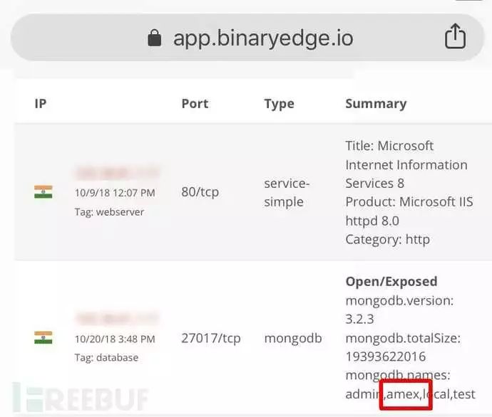 根据相关数据显示,这些记录似乎都来自印度的美国运通分公司。值得注意的是,在操作过程中并不需要使用任何特殊的程序,仅仅是通过Shodan一类的物联网搜索引擎或BinaryEdge.io来进行查找就可以得到相应的信息。